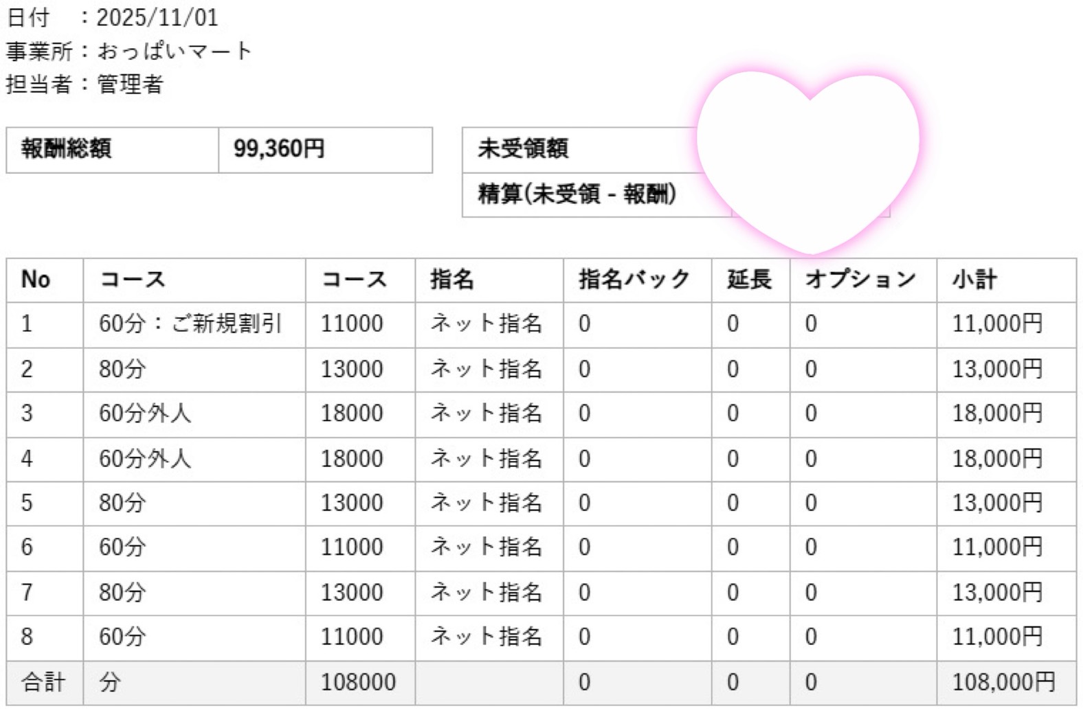 リアル明細💰ごめんなさい😓詰めすぎた…8本は疲れたね。ありがとうございます。店長 | 新宿デリヘル 【おっぱいマート】 巨乳専門店